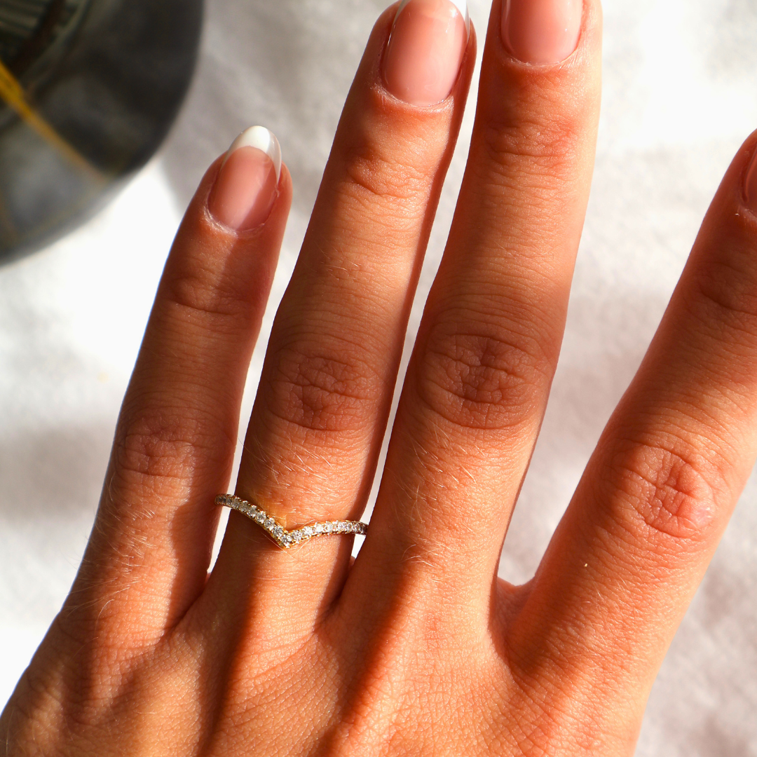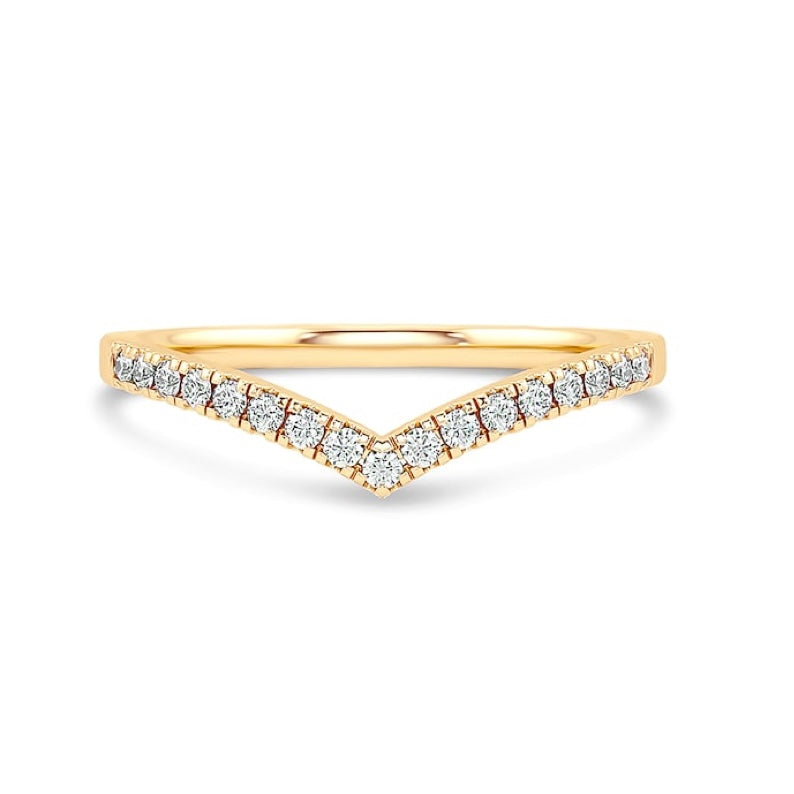 Now available in radiant gold, The Amour brings a touch of timeless sophistication to your collection. Measuring 2 mm along the band and 6 mm at the tip of its graceful V-shape, this versatile half-eternity ring is designed to complement any engagement ring style — or shine beautifully on its own. Crafted to pair seamlessly with our entire engagement ring line, The Amour adds an elegant, refined sparkle to every set. Also available in silver and rose gold.