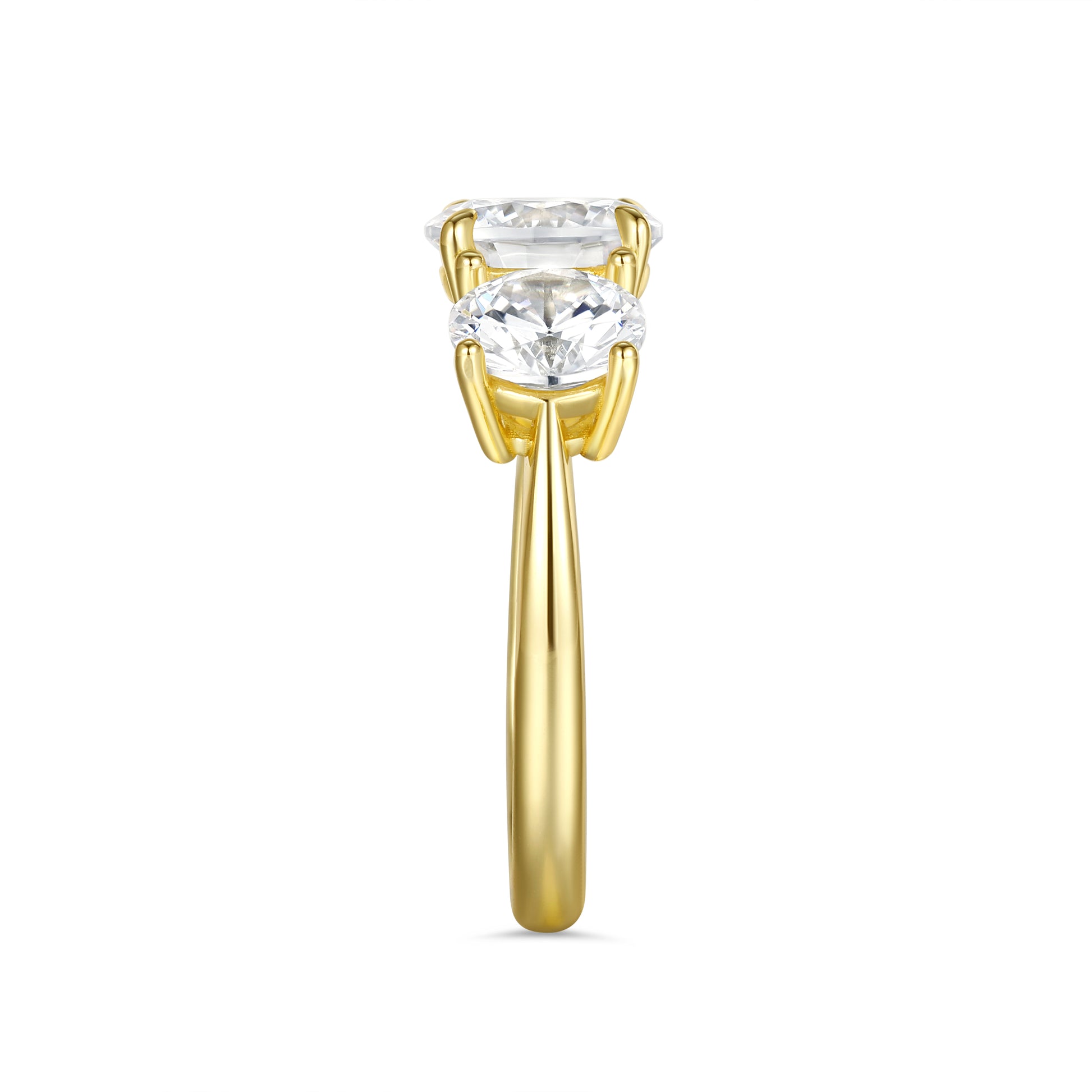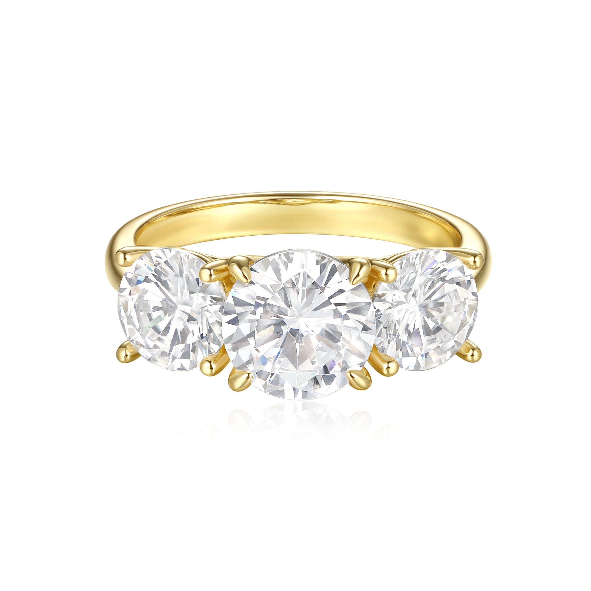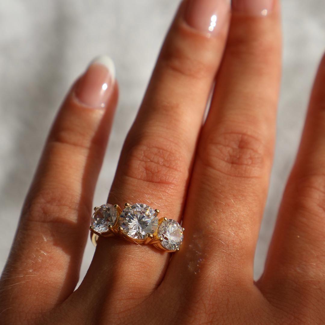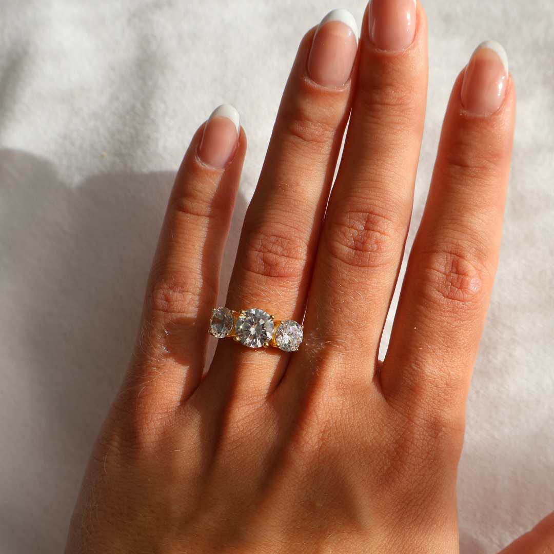Triple the stones, triple the sparkle — The Anastasia is a three-stone ring that elevates both engagement rings and everyday jewelry to new heights. Featuring a 2-carat round-cut center stone flanked by two 1-carat round-cut side stones, it rests on a sleek 925 sterling silver solitaire band for a modern, elegant finish. Perfect for an engagement, anniversary, or a special treat for yourself, The Anastasia proves that three really is the magic number for timeless elegance.