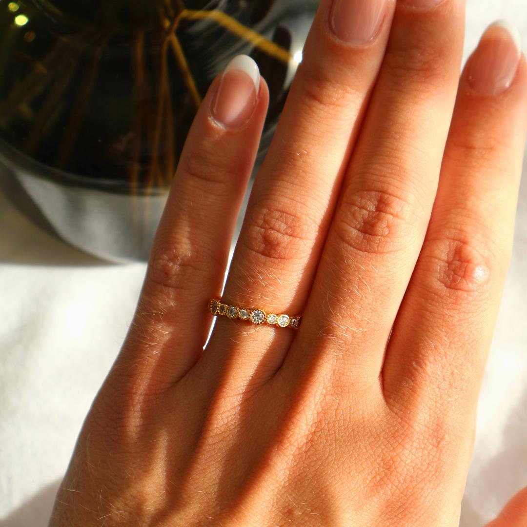 Simply stunning and designed with you in mind - The Aria is a statement piece that radiates brilliance from every angle. Featuring an array of beautifully cut stones in varying sizes, this 3.3 mm band delivers a one-of-a-kind sparkle and presence. Crafted from 925 sterling silver and finished with a protective rhodium plating, it offers both durability and dazzling shine. Whether worn solo, as a wedding band, engagement ring, or paired with another favorite piece, The Aria amplifies your sparkle - effortlessly