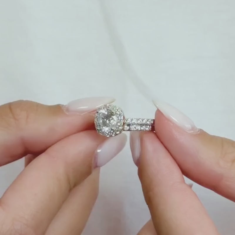Designed with everlasting elegance, The Delilah wedding set is a true celebration of timeless love. This exquisite duo features a stunning engagement ring with a brilliant 1.5 ct round-cut center stone surrounded by a radiant halo, paired with a graceful half-eternity wedding band. Crafted from premium 925 sterling silver in a refined semi-channel setting, it captures both sparkle and sophistication. Wear The Delilah on its own for classic beauty, or pair it with The Forever for a more captivating, layered look.