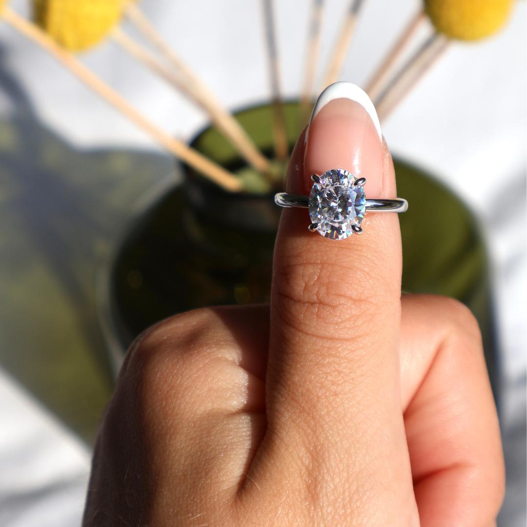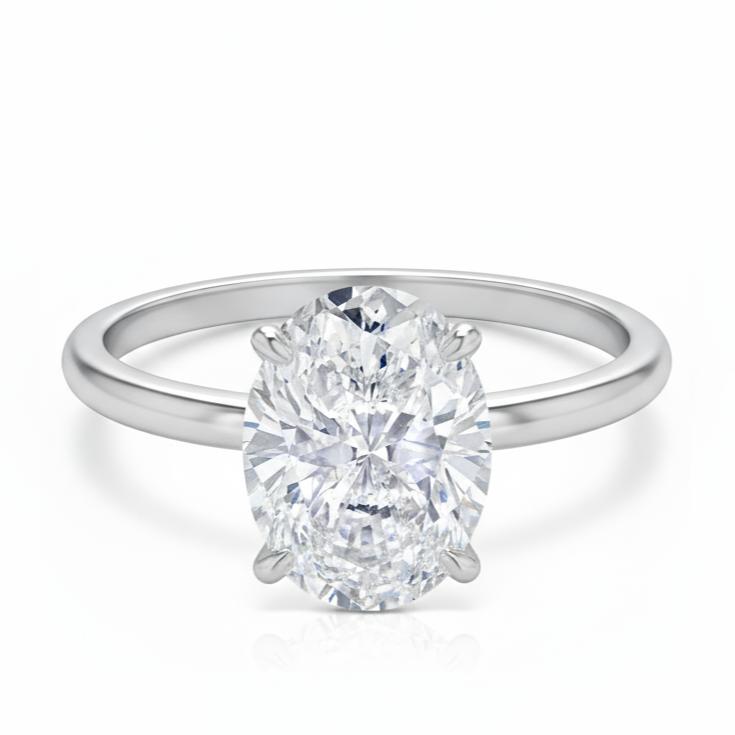 All your dreams come to life with The Helena, an exquisite oval solitaire engagement ring designed for all-day comfort-whether at the office, running errands, or enjoying a romantic night out. Its sparkling 3-carat conflict-free simulated diamond is accented by a hidden halo for an effortlessly feminine, eye-catching touch. Pair The Helena with The Forever for a seamless match, or mix in patterned bands like The Eternity, The Aria, or The Promise to create a stunning, personalized wedding set.