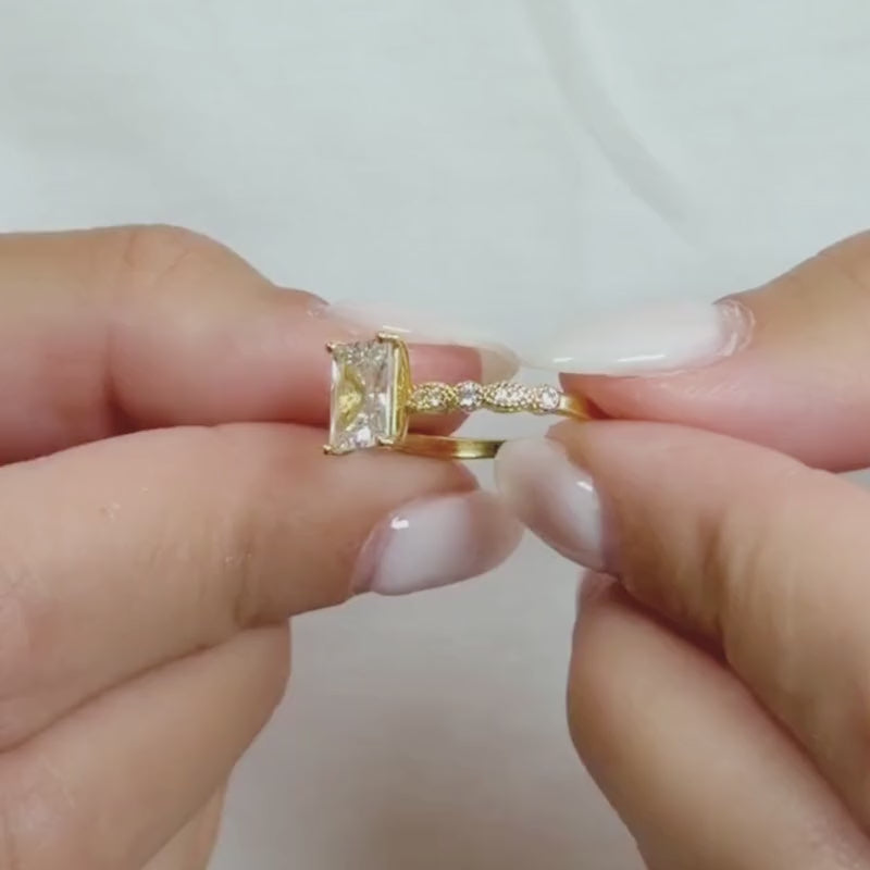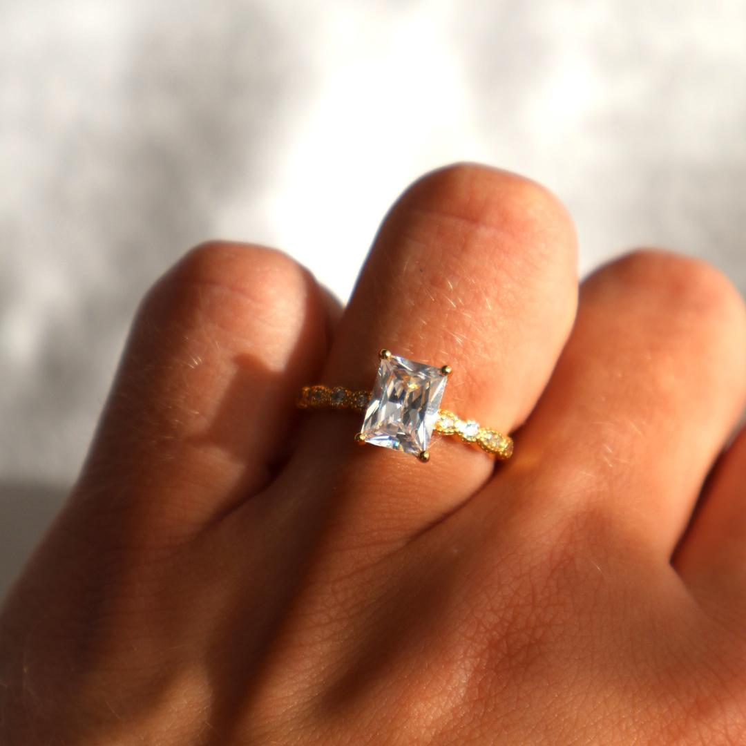 Elevate your favorite radiant cut with the elegant new gold finish of The Isabella. Featuring a 1.5-carat conflict-free simulated diamond set on a delicate 2.5mm vintage-inspired band, this ring is the perfect blend of feminine grace and bold sophistication. Designed to captivate, it’s a piece that will catch your eye - and your heart. Complete the look with the matching Aria band, or choose silver for a timeless alternative.