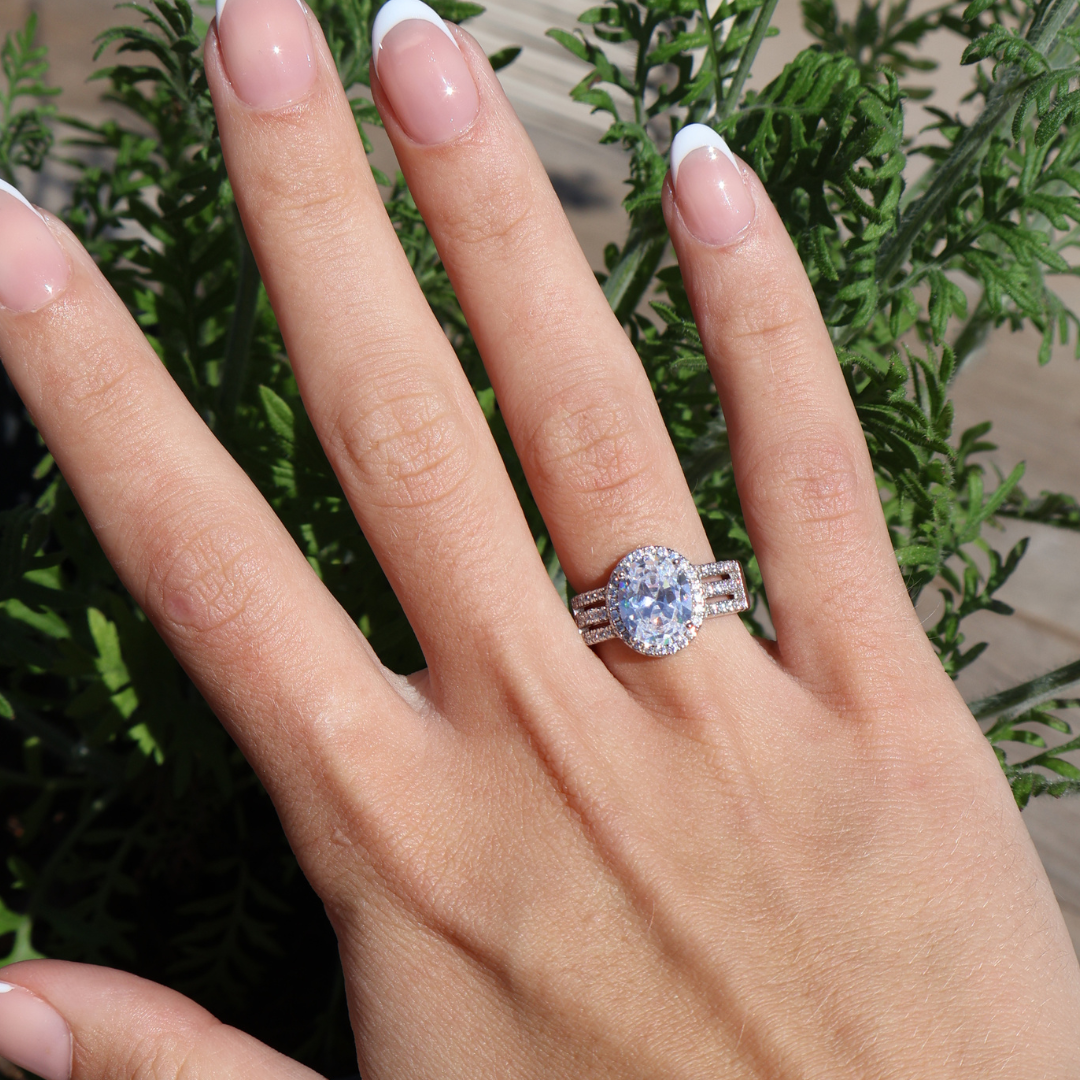 Fit for a queen, The Majesty is a wedding ring that exudes pure luxury. Featuring a dazzling 3-carat oval-cut conflict-free simulated diamond center stone, it’s surrounded by a sparkling halo and accented with triple channel rows of shimmering stones. Crafted from 925 sterling silver and plated in rhodium for lasting brilliance and durability, The Majesty is designed to make her feel like royalty.