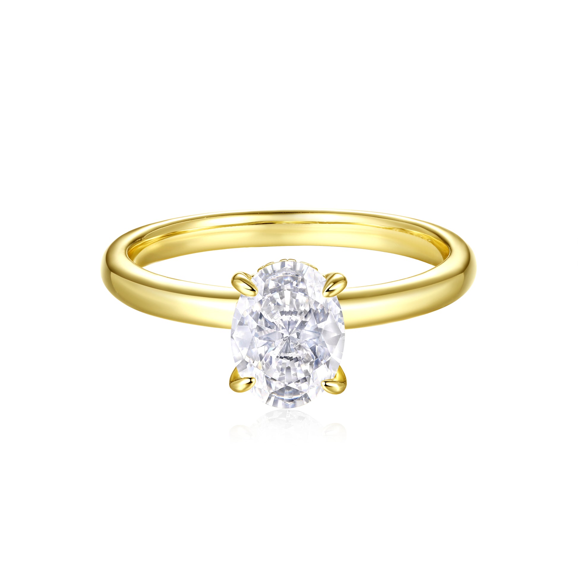 This classic solitaire design is crafted with an adorable 1.5 carat oval cut center stone and a hidden halo that sits on a sleek yellow gold band