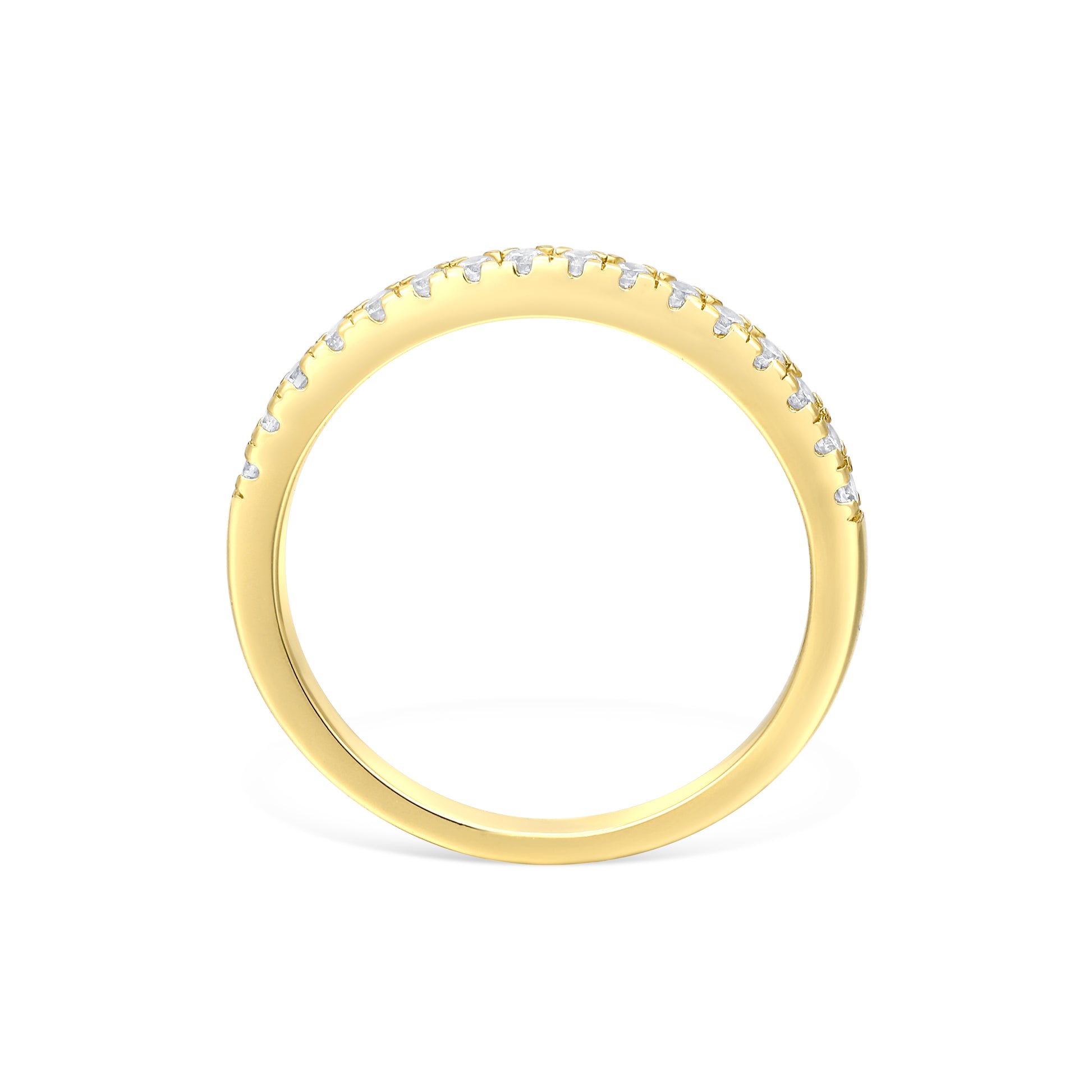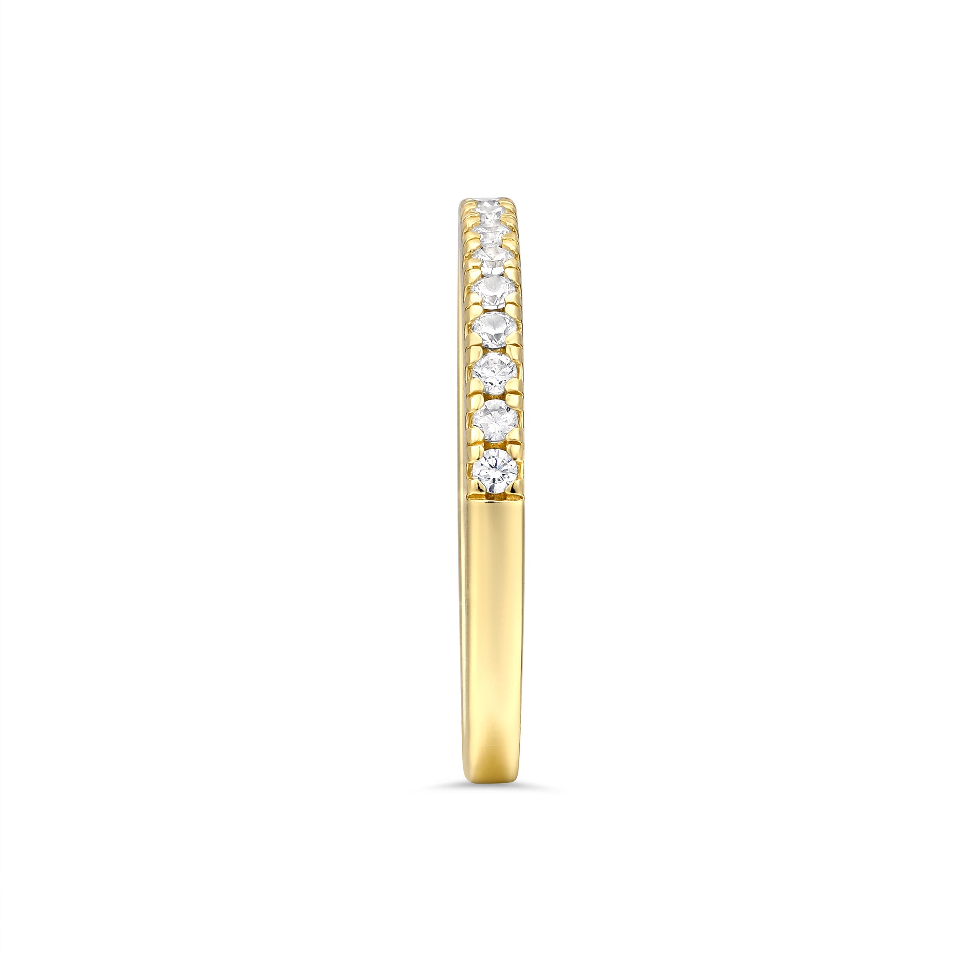 Introducing The Promise in classic gold - a half-eternity band designed to stand the test of time. At 2mm wide, it strikes the perfect balance: elegant yet understated. Sparkling stones grace the band halfway around, offering a comfortable fit with effortless sparkle. Wear it as your forever wedding band, layer it into a striking ring stack, or let it shine on its own - the choice is yours. Also available in rose gold and sterling silver.