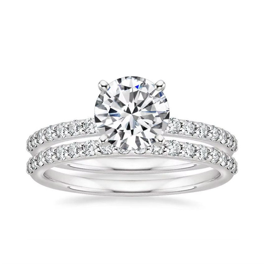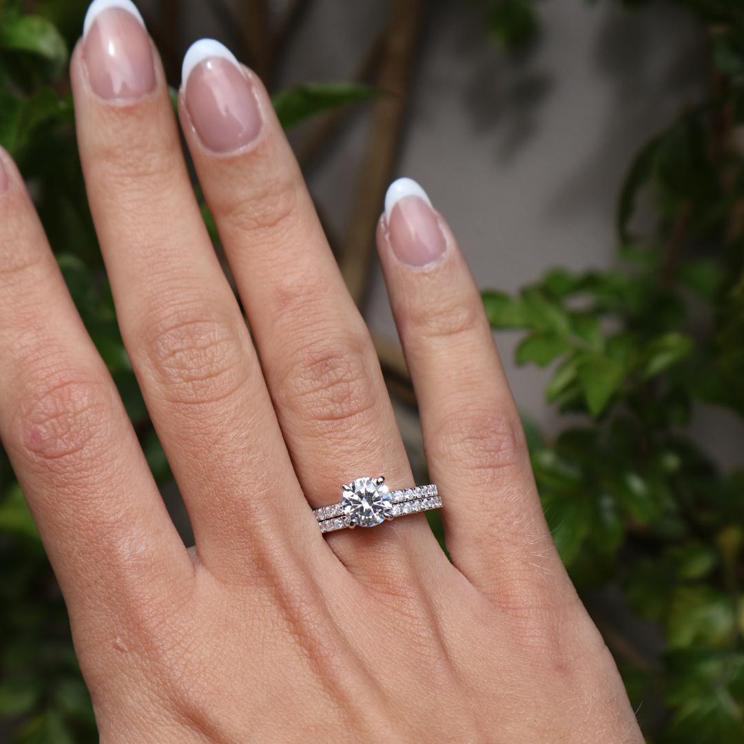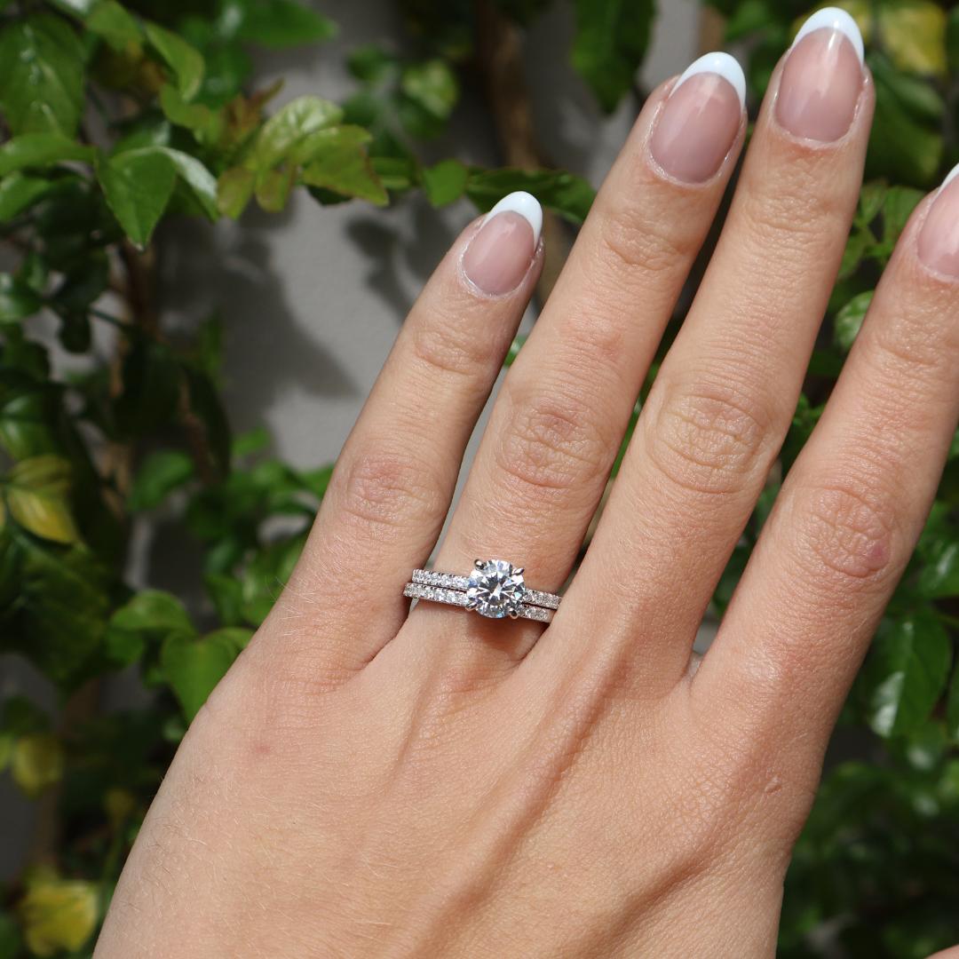 As captivating as a starry summer night, The Radiance is a ring she won’t be able to take her eyes off. Featuring a dazzling 1.75-carat round-cut conflict-free simulated diamond center stone, it’s complemented by sparkling side stones on both the engagement ring and matching wedding band. Crafted in timeless 925 sterling silver, this solitaire bridal set shines for a lifetime—and when paired with a third band like The Promise, it creates a show-stopping triple-ring stack that’s truly out of this world.