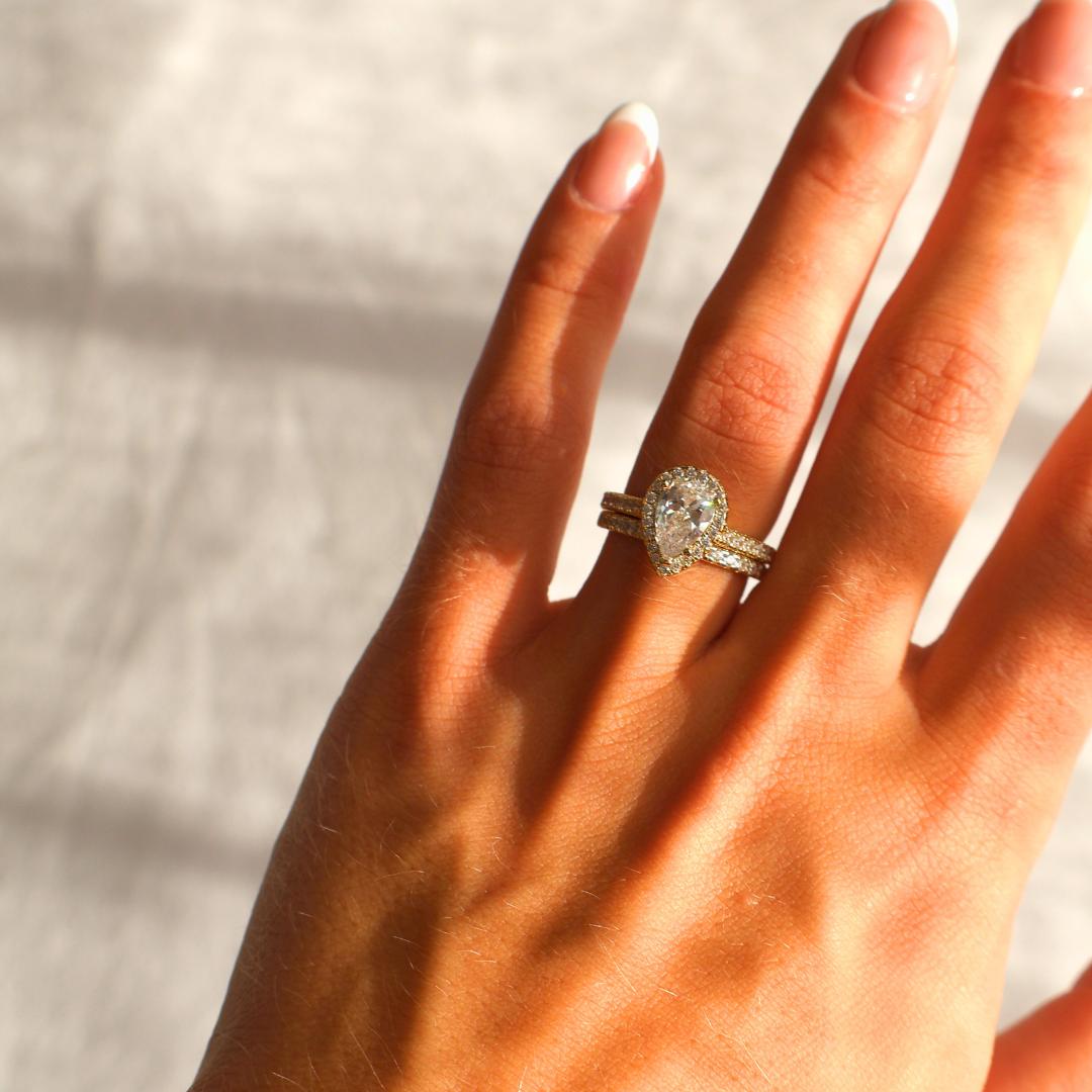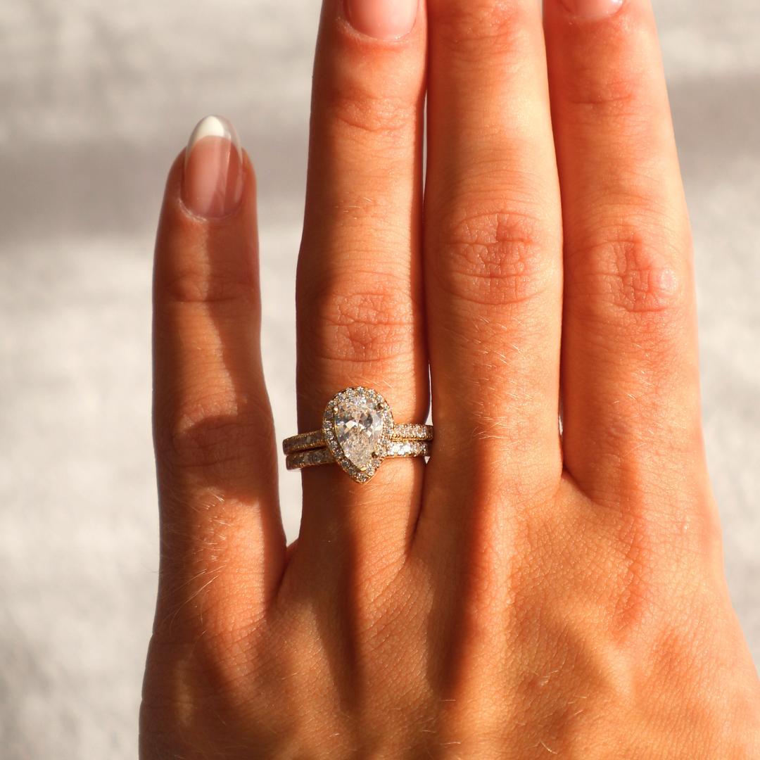 Thought The Serenity couldn’t get any more breathtaking? Think again! Our best-selling pear-cut wedding ring set now shines in a stunning yellow gold finish. The 2-carat, conflict-free simulated diamond center is framed by a delicate halo of sparkling gemstones, creating unmatched brilliance. Complete your set with the included half-eternity band, or stack it with The Forever for the ultimate triple-ring look. Also available in silver.
