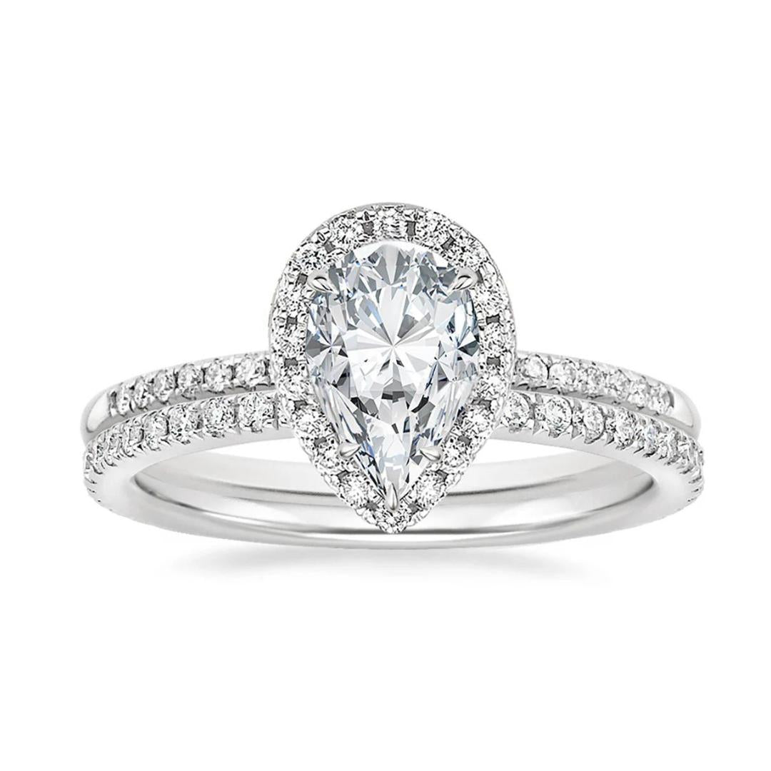There’s something truly captivating about the way a pear-cut stone reflects the light — and The Serenity wedding set captures that magic flawlessly. Featuring a breathtaking 2 ct pear-cut center stone framed by a radiant halo and complemented by a half-eternity band, this set delivers irresistible sparkle from every angle. The matching half-eternity wedding band sits perfectly flush with the engagement ring, creating a seamless, elegant look. Wear The Serenity on its own for timeless brilliance, or pair it with unique bands like The Amour or The Promise for a stunning triple-stack you won’t be able to stop admiring. Also available in gold.
